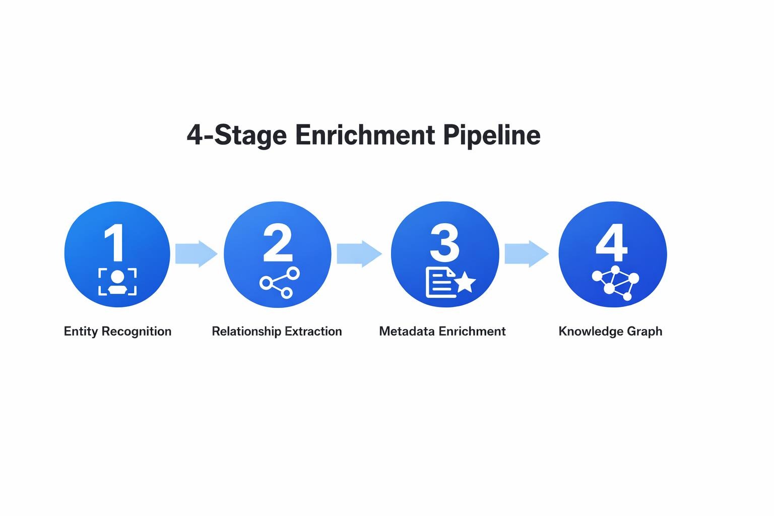 - The pipeline has four core stages: Named Entity Recognition (NER), relationship extraction, semantic metadata enrichment, and knowledge graph integration. Each stage builds sequentially to produce relationship-aware context that agents can query without complex SQL joins.