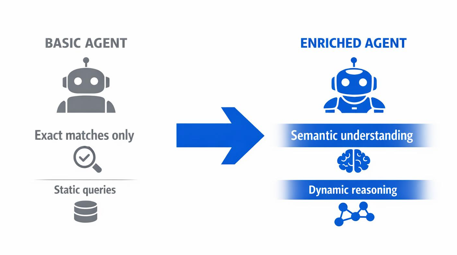Semantic enrichment changes how AI agents interact with data through relationship-aware reasoning and dynamic context understanding. Instead of static queries against flat schemas, agents navigate semantic connections through relationship traversal. This reduces hallucinations through grounded retrieval and improves accuracy through semantic similarity over keyword matching.