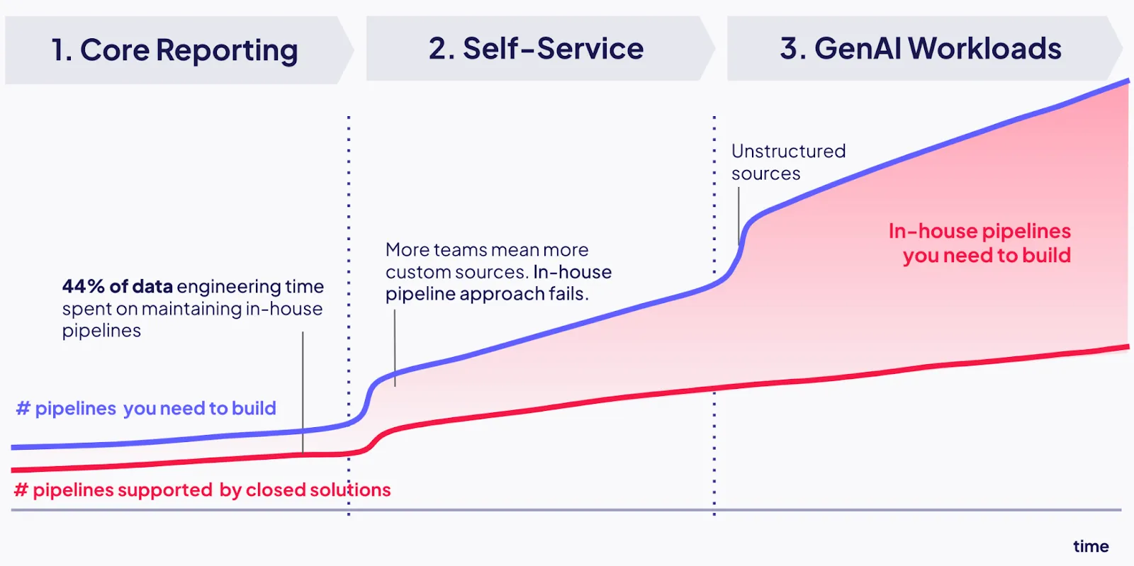As your data infrastructure needs to evolve, closed-source ETL/ELT solutions often fall short. You’ll likely have found that these solutions struggle to support both internal compliance must-haves, as well as the full range of data sources your business needs visibility into. This lack of flexibility leads to the development of bespoke pipelines—custom, error-prone, hard to maintain solutions built to bridge the gaps in your data architecture. This fragmentation can stifle innovation and slow down the pace of your data operations.