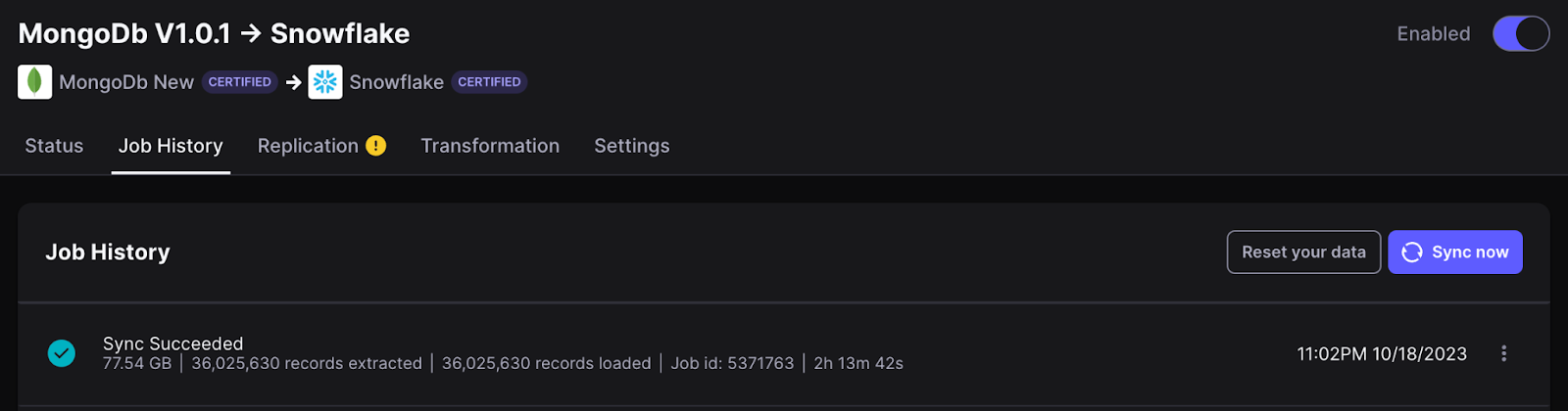 Replicating a 36 million document dataset from MongoDB to Snowflake with the new version of our mongo-db source connector resulted in an effective replication rate just above 10 MB / s . We moved over 77 GB in just over 2 hours. This speed corresponds to a significant throughput improvement relative to the previous version of the connector. The main factors contributing to increased speed are: