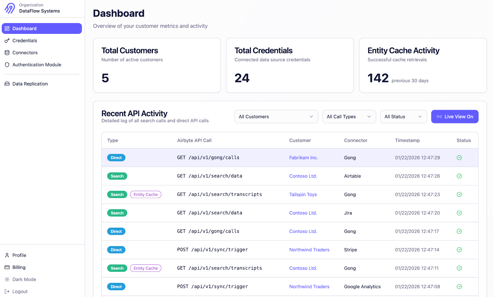 The Entity Cache stores a subset of relevant data from connected sources in Airbyte-managed object storage, enabling your agents to perform efficient search operations without repeatedly querying vendor APIs. The cache helps improve latency of your more complex prompts by allowing your agents to reliably search across records in half a second or less.