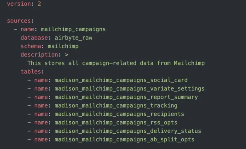 Another thing to note, if you have sources or tables with the same names, dbt will throw an error when you try to run your model. For example, you can’t have two different campaigns tables under two different sources. You know they are different, but dbt does not. This is why I recommend prefixing your source and table names with the data source itself.
