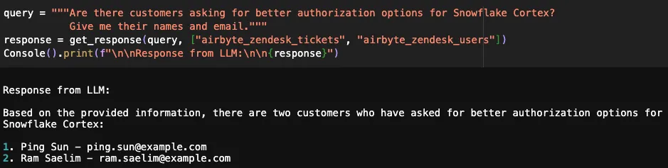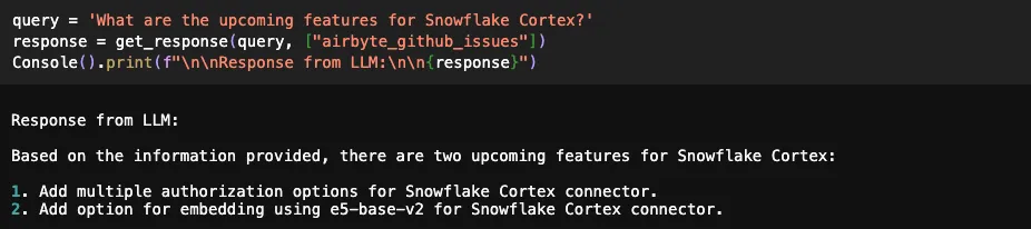 Conclusion Using Airbyte’s catalog of 550+ connectors and the LLM capabilities of Snowflake Cortex, you can build an insightful AI assistant to answer questions across a number of data sources. We have kept things simple here, but as your number of sources increase, consider integrating an AI agent to interpret user intent and retrieve answers from the appropriate source.
