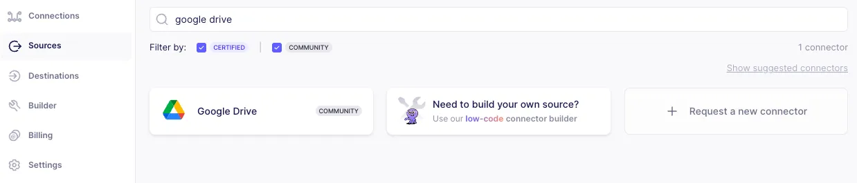 Destination name: Provide a friendly name. Processing: Set chunk size to 1000 (the size refers to the number of tokens, not characters, so this is roughly 4KB of text. The best chunking is dependent on the data you are dealing with). You can leave other options as empty. You would usually set the metadata and text fields to limit reading of records to specific columns in a given stream. Embedding: Select OpenAI from the dropdown and provide your OpenAI api key for powering the embedding service. You can use any other available models also. Just remember to embed the questions you ask the product assistant with the same model. Indexing: Provide credentials for connecting to your Snowflake instance. Step 2: Set up Google Drive, Github and Zendesk sources To select a source, click on sources tab on left, select “New Source” and filter for your source you are looking for.