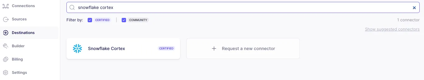 Airbyte cloud instance Snowflake account with Cortex functions enabled Open AI Source specific: Google drive, Github and Zendesk Step 1: Set up Snowflake Cortex destination To select a destination in Airbyte Cloud, click on the Destinations tab on left, select “New Destination” and filter for the destination you are looking for.