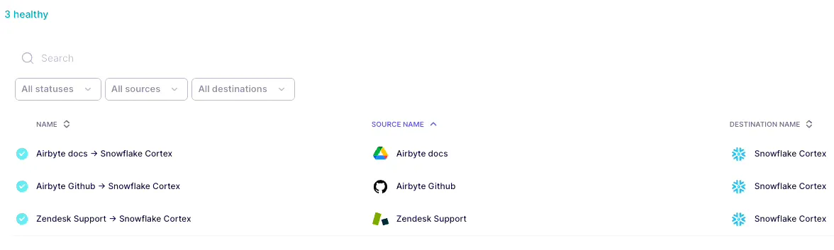 On the configure connection screen, select the Schedule type to every 24 hours. Optionally provide a stream prefix for your table. In our case we prefix airbyte_ to all streams. Click on Finish and Sync. If everything went well, there should be a connection now synching data from Zendesk to Snowflake Cortex destination. Give the sync a few minutes to complete. Once the first run has completed, you can check Snowflake to confirm data sync. The data should be synched under a table named “[optional prefix]tickets” and ““[optional prefix]tickets” Once all the three connections are set, the Connections screen should look like this: