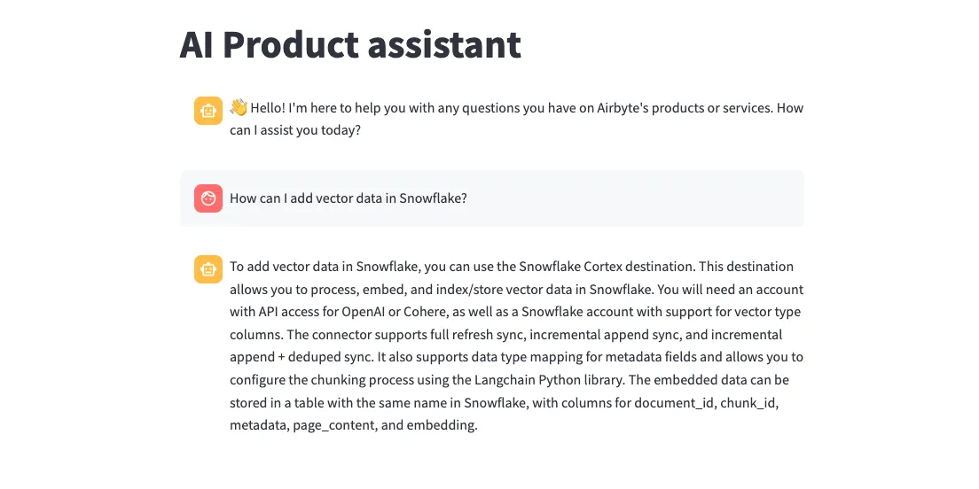 As a practical example, we'll build an AI Product assistant — an AI chatbot capable of answering product-related questions using data from multiple Airbyte-related sources. With the AI Product Assistant, you can ask questions across all your company’s data in one place.
