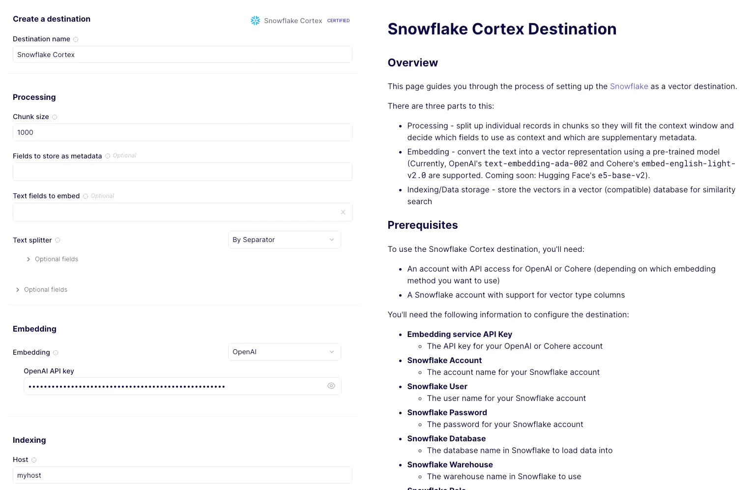 Configure the Snowflake Cortex destination in Airbyte: