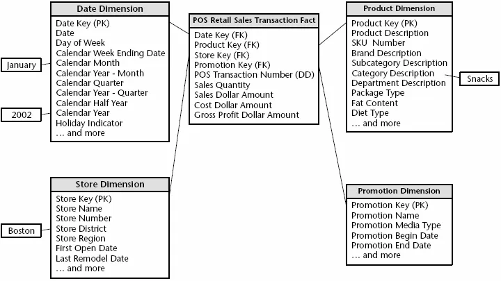 In dimensional modeling, data is typically stored in a star schema or snowflake schema (more later), where a central fact table contains the quantitative data, and it is connected to multiple dimension tables, each representing a specific aspect of the data’s context. This structure enables efficient querying and aggregation of data for analytical purposes.