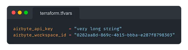 Then, navigate to Airbyte’s developer portal and generate your API key. Store both the Workspace ID and API key in a <span class="text-style-code">terraform.tfvars</span> file.