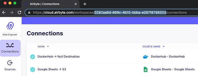 Setup Airbyte Cloud First, you need to sign up for an Airbyte Cloud account. Once you have an account, save your workspace ID. It’s a UUID provided within the main URL:
