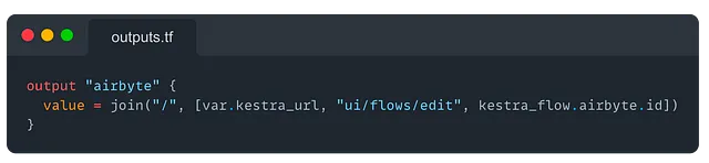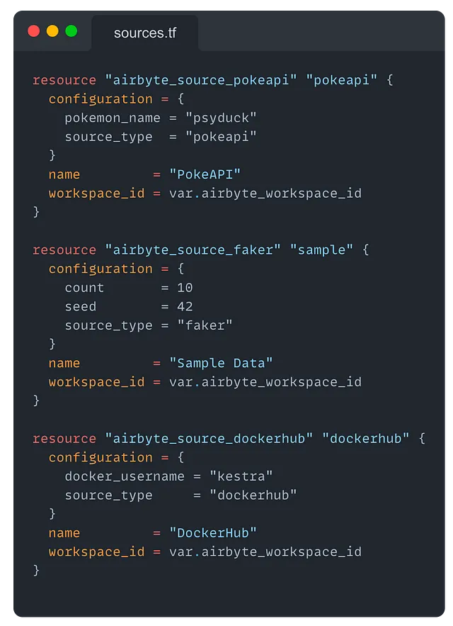 sources.tf - includes configuration of three example source systems : PokeAPI, Faker (sample data ), and DockerHub destinations.tf - configures the destination for your synced data (for reproducibility, we use a Null destination that will not load data anywhere ) variables.tf - sets dynamic variables such as the Airbyte API key and workspace ID set in terraform.tfvars outputs.tf - after you run terraform apply, the output defined here returns the URL to the flow page in Kestra UI (from which you can run the workflow ) main.tf - the main Terraform configuration file specifying required providers, Airbyte connections, along with the end-to-end scheduled workflow. Note how Terraform helps reference the resources to avoid redundancy. This way, you can ensure that your orchestrator (here, Kestra ) always uses the right connection ID and that your data ingestion jobs, data pipelines, IAM roles, database schemas, and cloud resources stay in sync. How does Kestra help? While you could schedule data ingestion jobs directly from Airbyte, integrating those within an end-to-end orchestration pipeline gives you several advantages: