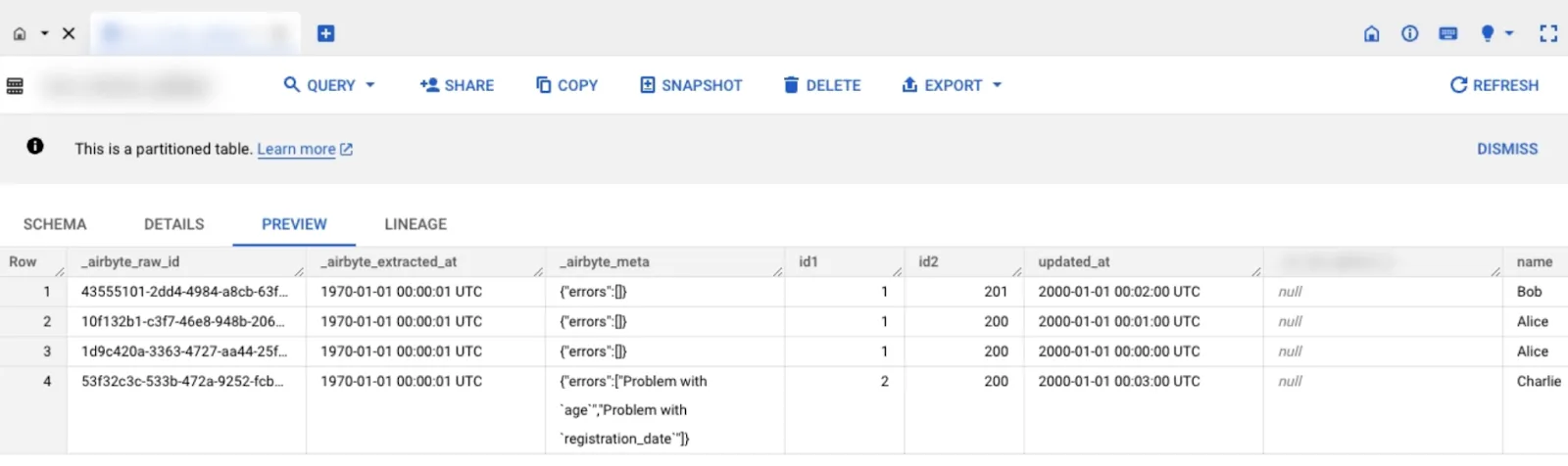 One-to-one table mapping: Data in one stream will always be mapped to one table in your data warehouse. No more sub-tables. Improved per-row error handling with _airbyte_meta: Airbyte will now populate typing errors in the _airbyte_meta column instead of failing your sync. You can query these results to audit misformatted or unexpected data. Internal Airbyte tables in the airbyte_internal schema: Airbyte will now generate all raw tables in the airbyte_internal schema. We no longer clutter your desired schema with raw data tables. Incremental delivery for large syncs: Data will be incrementally delivered to your final tables when possible. No more waiting hours to see the first rows in your destination table.