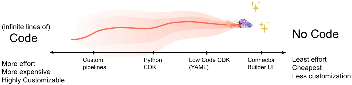 If the API connector you need is incompatible with the builder, you can use the low-code CDK to deploy your custom connector to your workspace. The low-code CDK is the framework upon which we built the connector builder and supports more advanced features and components, as well as supporting custom Python components. So if the API you want to integrate with requires a particularly whacky authentication or pagination scheme, you can always write the code for that specific component in Python and the rest of the connector can still leverage the benefits of the low/no-code paradigm.