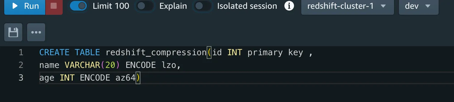 You can also specify a compression encoding of your choice while creating a table using the ENCODE keyword, as shown in the image below.