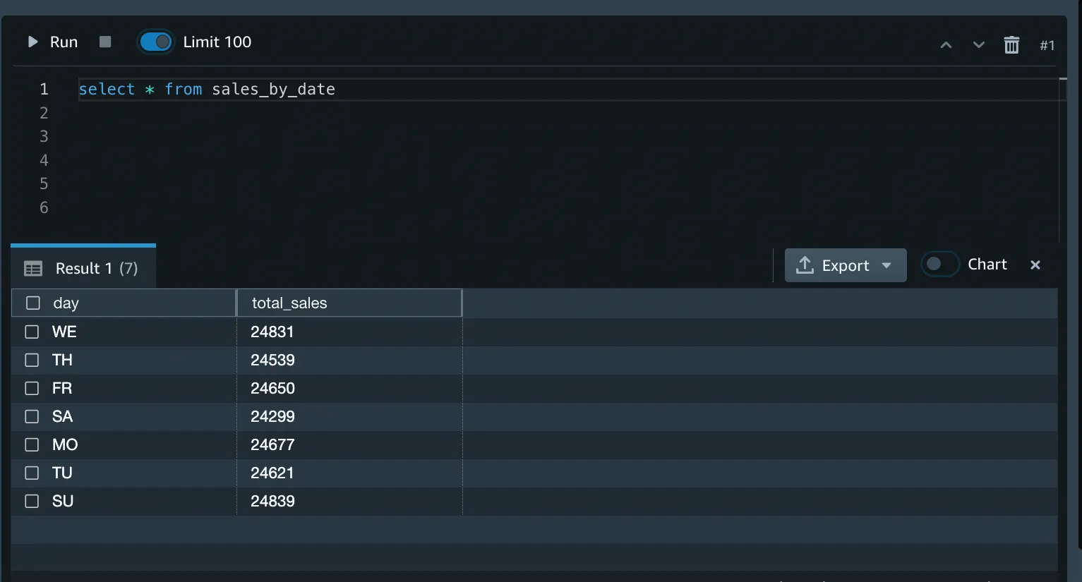 If you want to generate some insights, like the days with the highest sales, you can easily create a materialized view, as shown below.