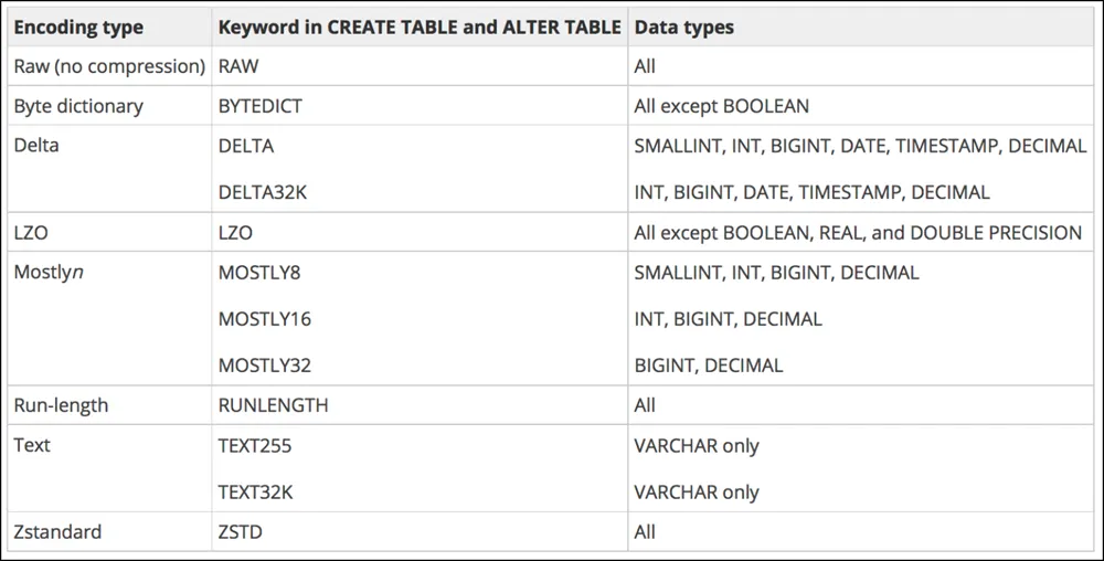 Use the appropriate compression encoding format Compression is necessary because it saves storage space and reduces the size of data read from the disk. When storage space is saved, and data size is reduced, query performance increases. There are different compression techniques used in Amazon Redshift.
