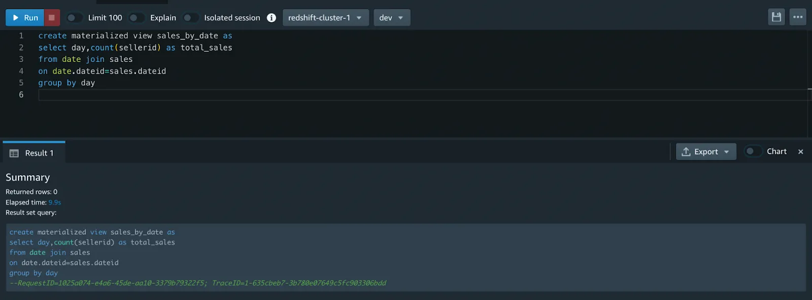 Here, a materialized view with the name sales_by_date was created. You can preview the results of your materialized view by running the query in the image below.