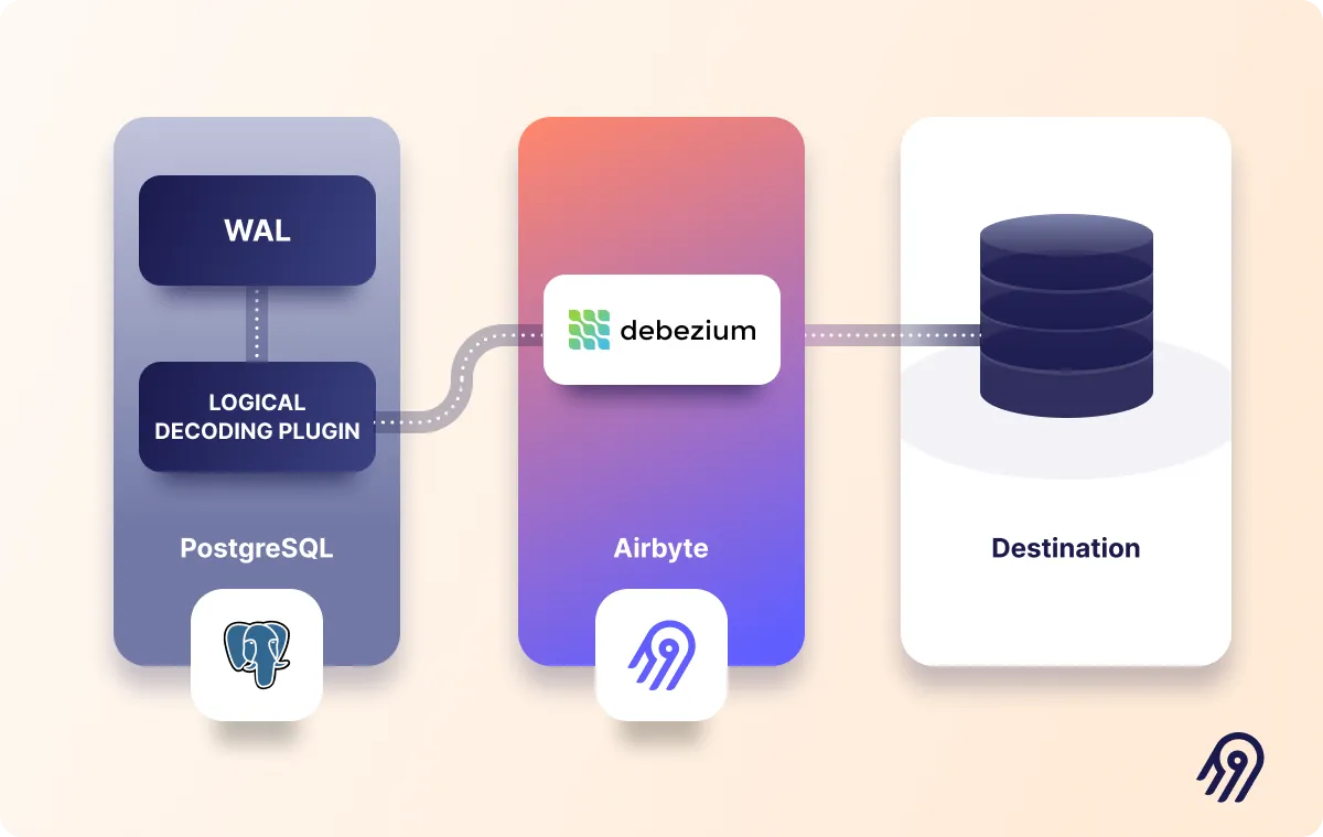 To support CDC, Airbyte uses Debezium internally. A high-level example of CDC replication from a Postgres source is shown in the image below.