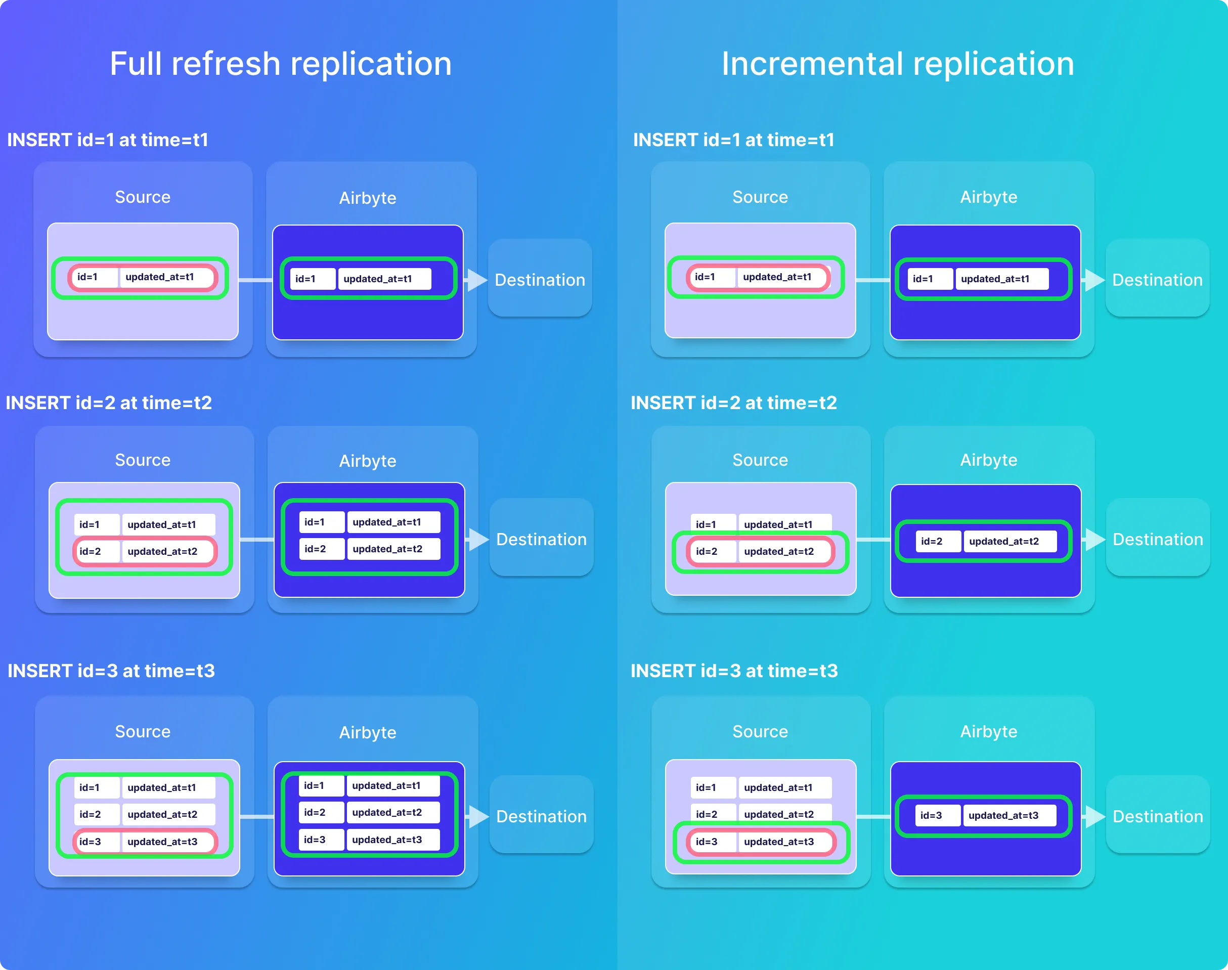 The image below compares full refresh replication versus incremental sync replication – this diagram represents records that are inserted at various times: t1, t2, and t3 with each insert followed by a sync run. Newly inserted records are annotated on the source with a red box, and records that are sent to the destination are annotated with a bright green box.