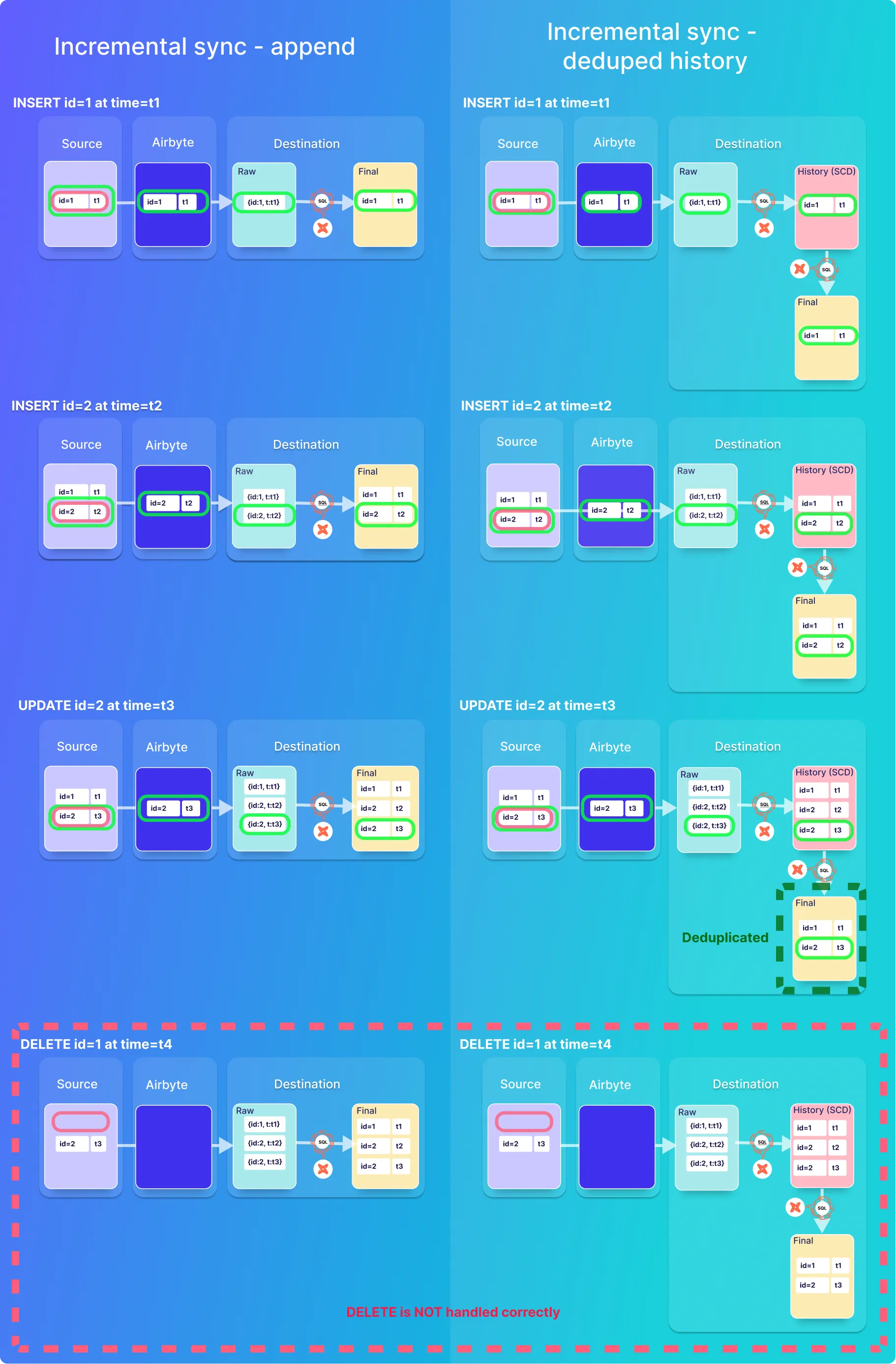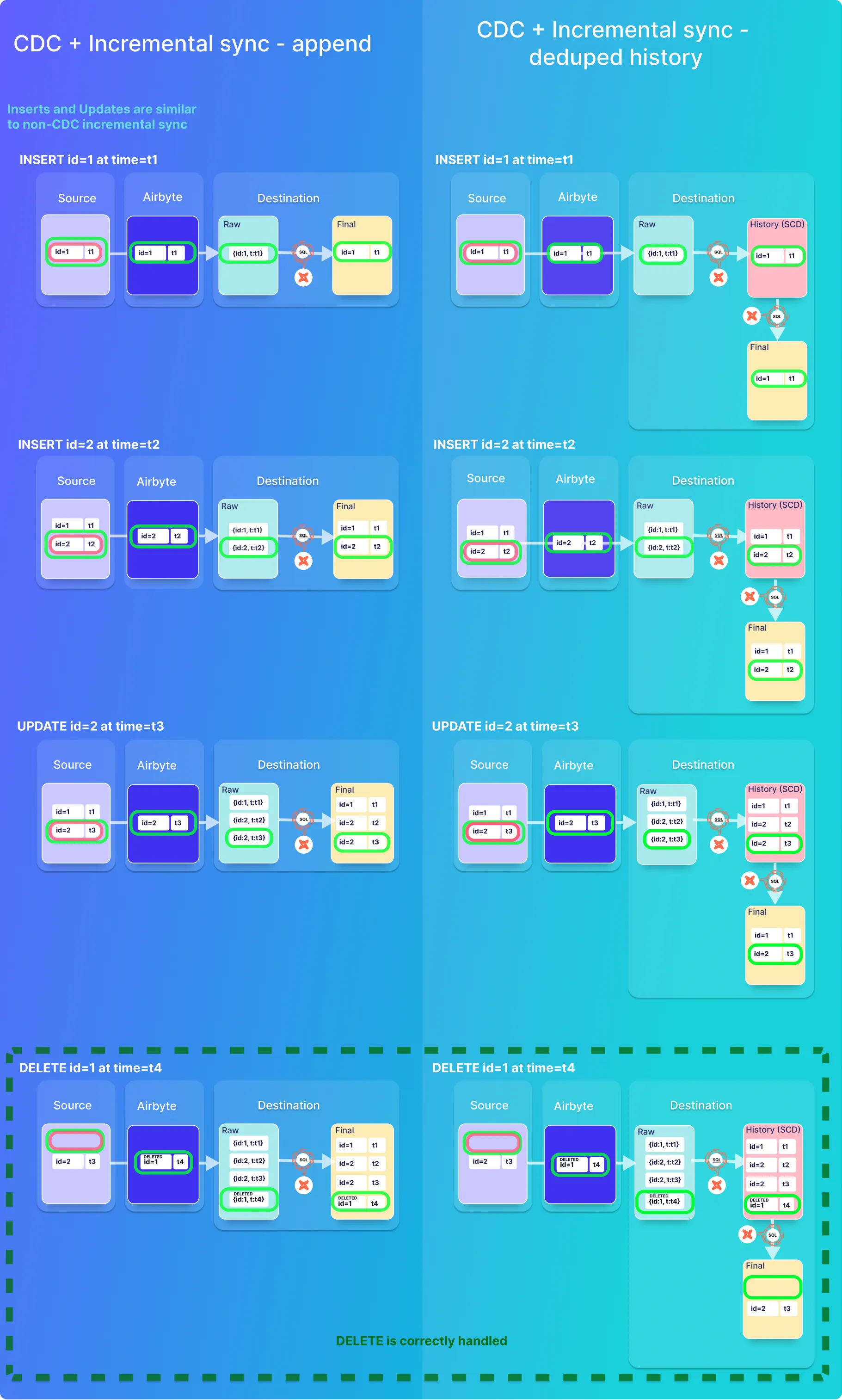 The image below demonstrates the differences between CDC + incremental sync - append and CDC + incremental sync - deduped history replication.This diagram represents records that are inserted at time t1 and t2, followed by an updated to an existing record (with id=2) at t3, and a deletion of a record (id=1) at t4.