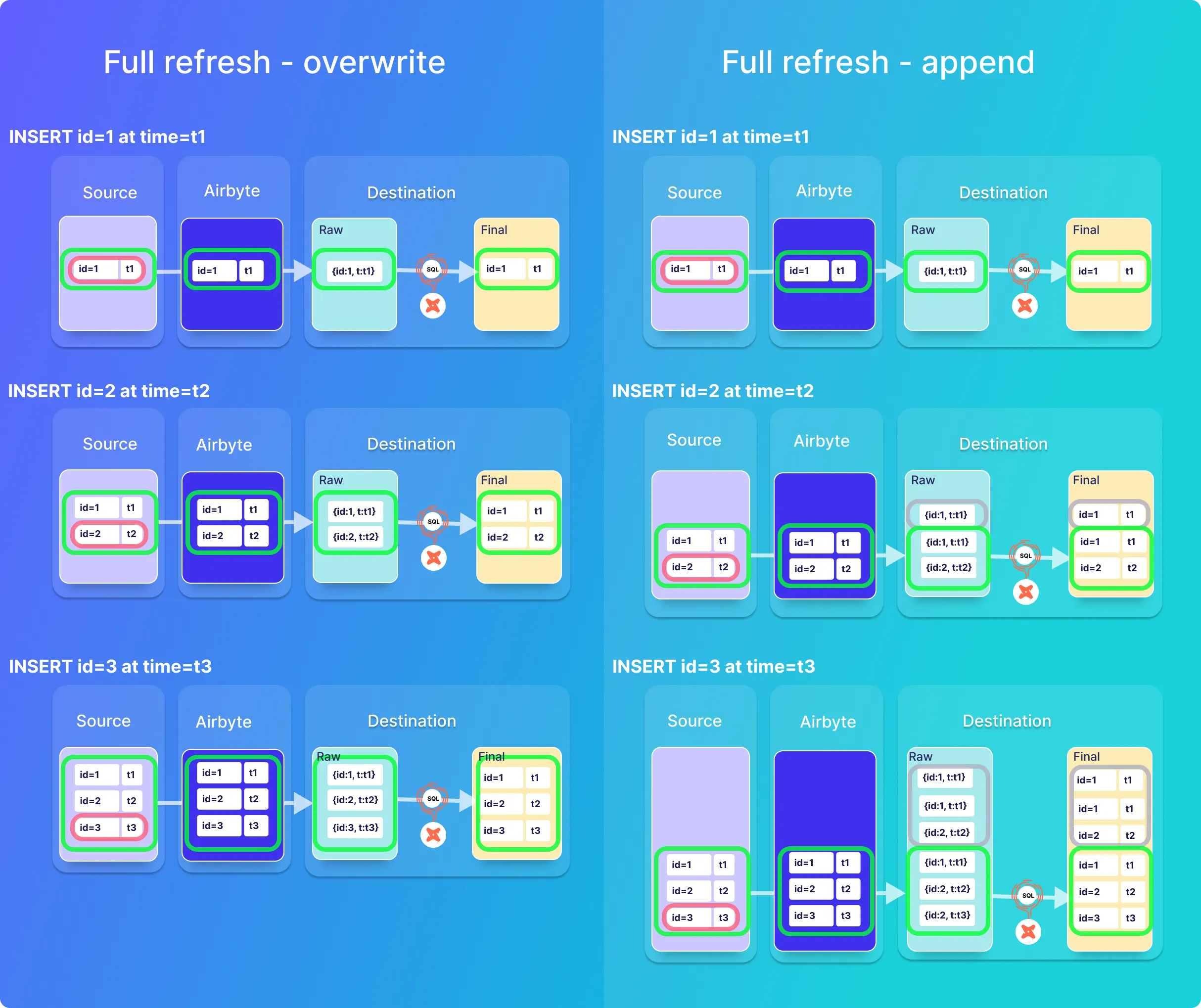 Full refresh - overwrite Full refresh - append Raw and final destination tables are overwritten with the full data set in each sync run. The entire data set is appended to the raw and final destination tables in each sync run.