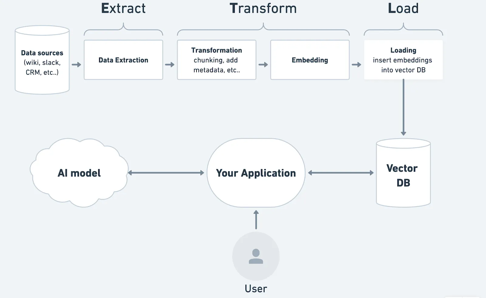 The diagram above illustrates what this looks like when using RAG, but you can imagine that even if you’re not using RAG, the basic steps are unlikely to change: you need to Extract, Transform, and Load aka ETL[2] the data in order to build AI models which know non-public information specific to you and your use case.