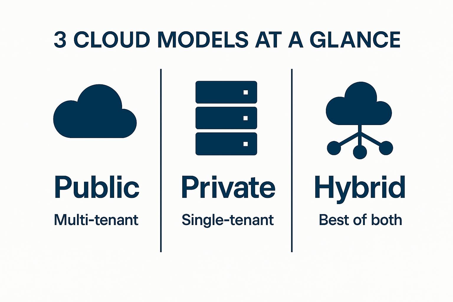 Choosing among the three models comes down to control versus agility. Public clouds trade ownership for near-limitless scale, private environments guarantee isolation at a higher cost, and hybrid approaches give you the best of both if you can manage the complexity.