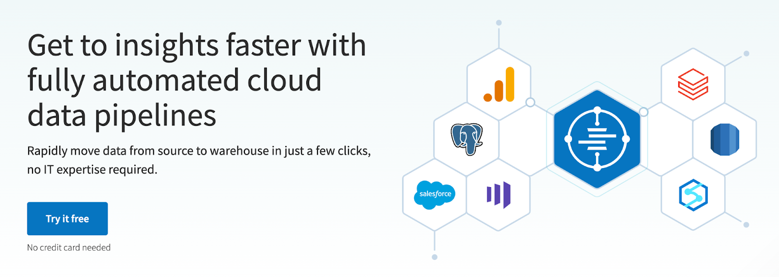 Stitch is a simple, developer-focused ELT tool designed to move data quickly from multiple sources to data warehouses. It offers a straightforward setup and transparent pricing model, which makes it attractive for small and medium-sized teams.