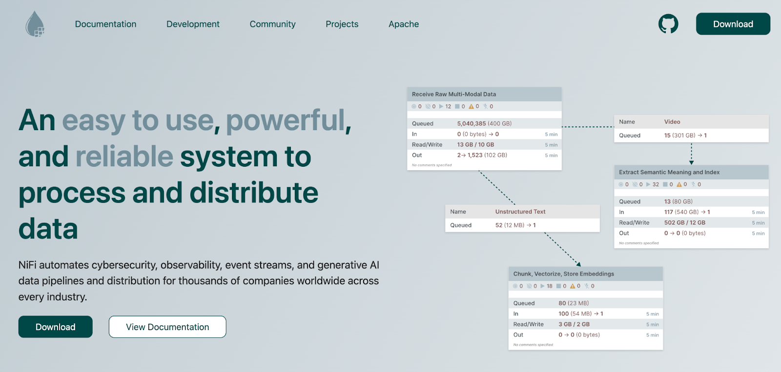Apache NiFi is an open-source data flow automation tool that enables the design of complex workflows through a visual user interface. It supports real-time streaming and batch data movement, offering a flexible solution for routing and transforming data.
