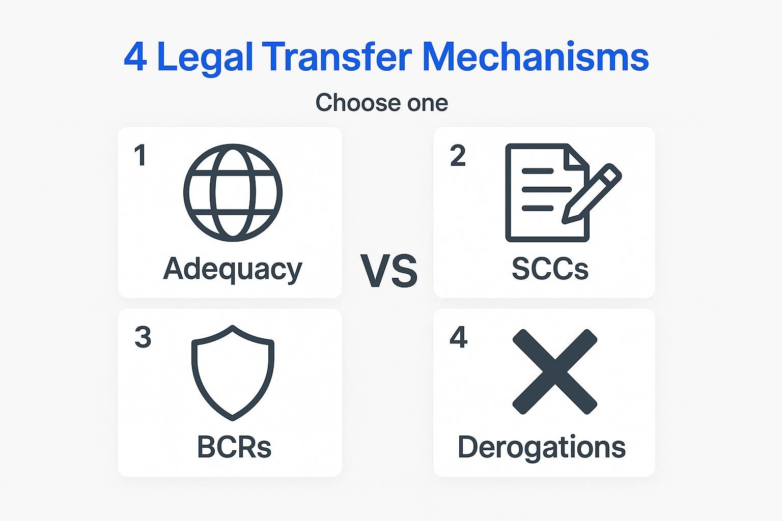 Adequacy decisions offer the clearest path forward. When the European Commission recognizes a country as adequate (Japan, the UK and others), data flows with no additional paperwork. Without adequacy, you work down the hierarchy: Standard Contractual Clauses, Binding Corporate Rules, or narrowly defined derogations. After the Court of Justice's Schrems II judgment, these alternatives typically require supplementary measures and a documented Transfer Impact Assessment.
