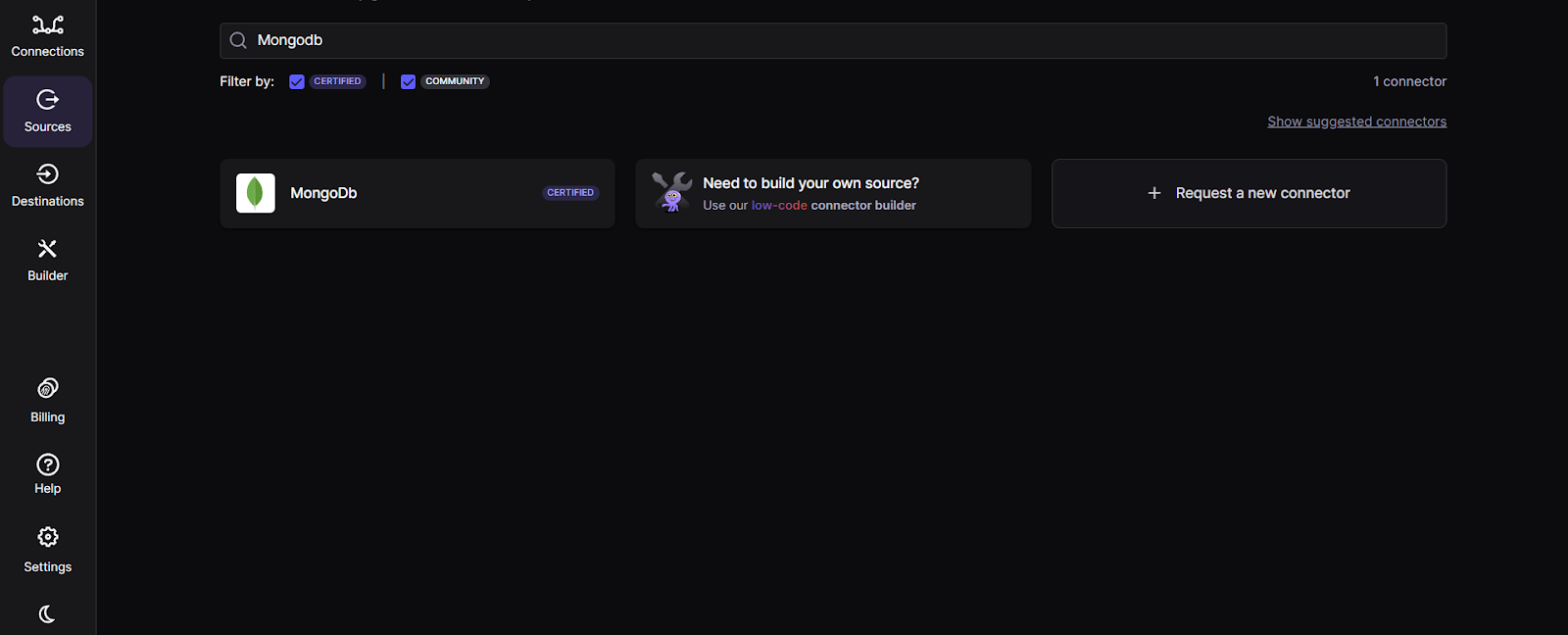 - On the Sources section, use the search bar at the top and type in MongoDB. Click on it when you see the connector.