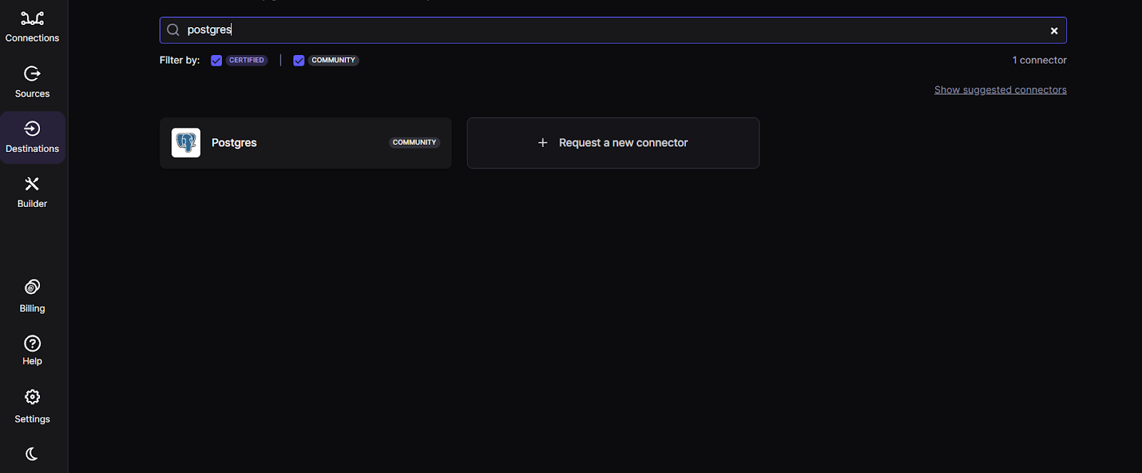 - On the Destinations page, use the search bar to find the destination of your choice (let’s take PostgreSQL).