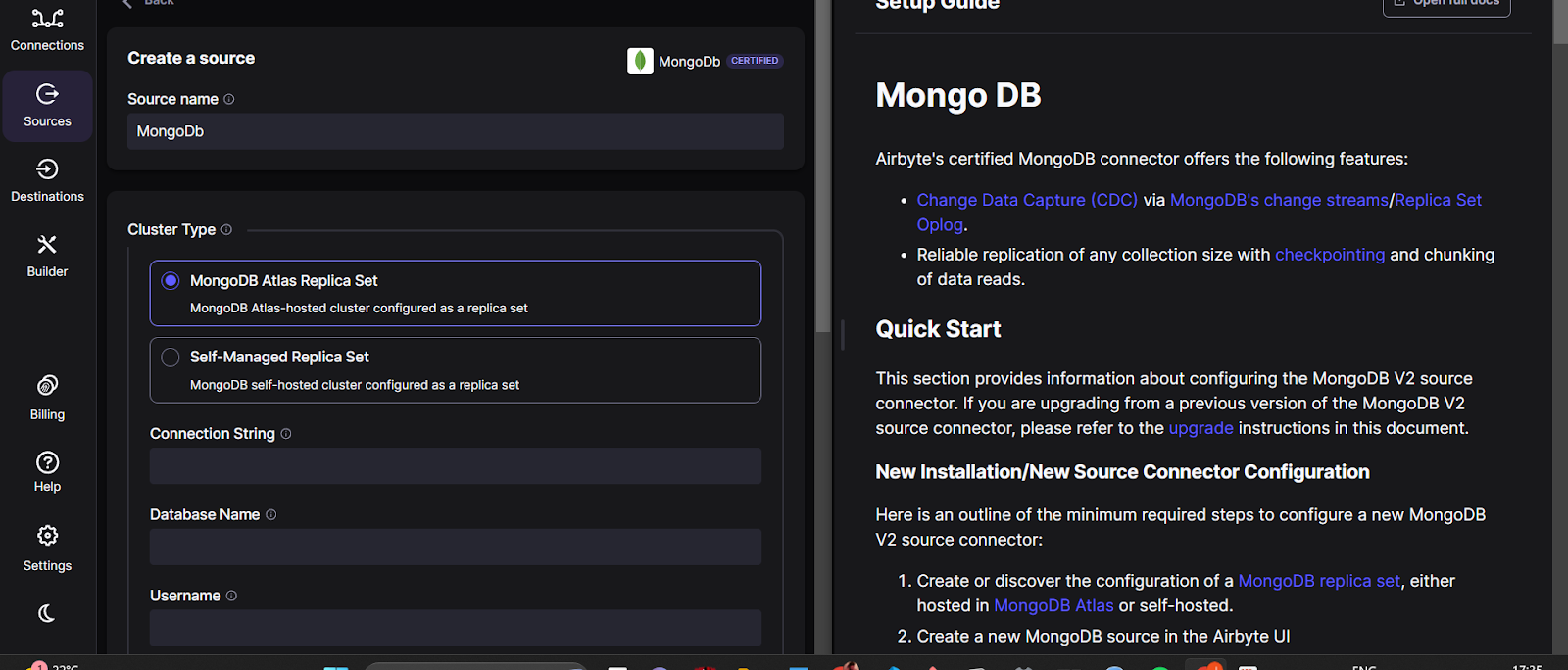 Airbyte is a popular data integration tool that allows you to streamline the MongoDB CDC process with its easy-to-use interface and extensive library of connectors. Here’s a step-by-step guide on performing CDC with the MongoDB connector of Airbyte: