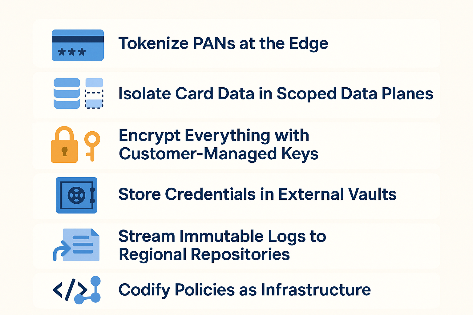 The foundation of compliant architecture begins with classifying payloads at the edge and replacing PANs with tokens wherever your workflow allows. Tokenization services shrink scope before data even lands in your infrastructure.