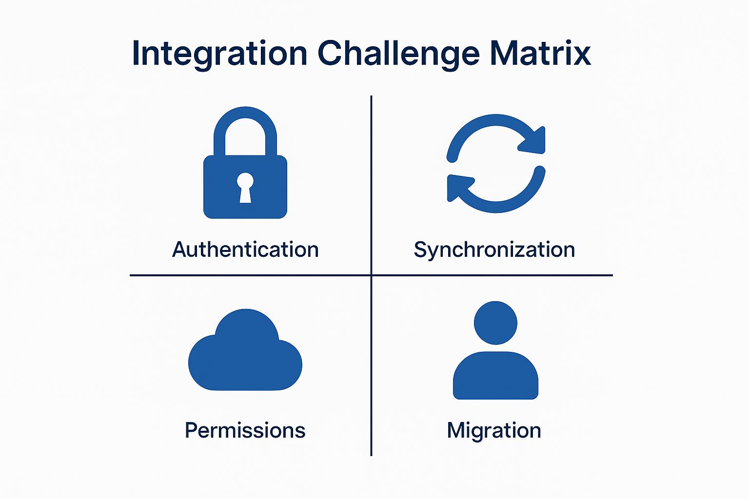 Authentication setup requires careful configuration of OAuth connections, certificate management, and secure credential storage. Permission mapping design must account for both platform security models while maintaining least-privilege access principles.