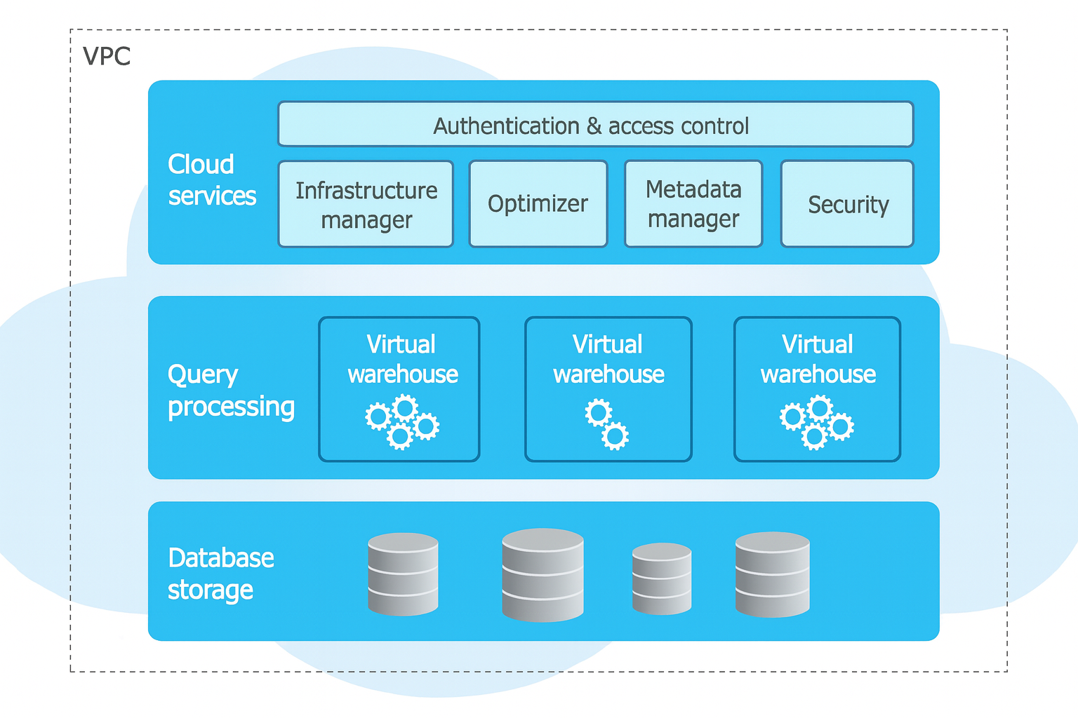 Snowflake architecture mainly consists of three layers: cloud services, query processing, and storage. Let's take a look at each of them in detail: