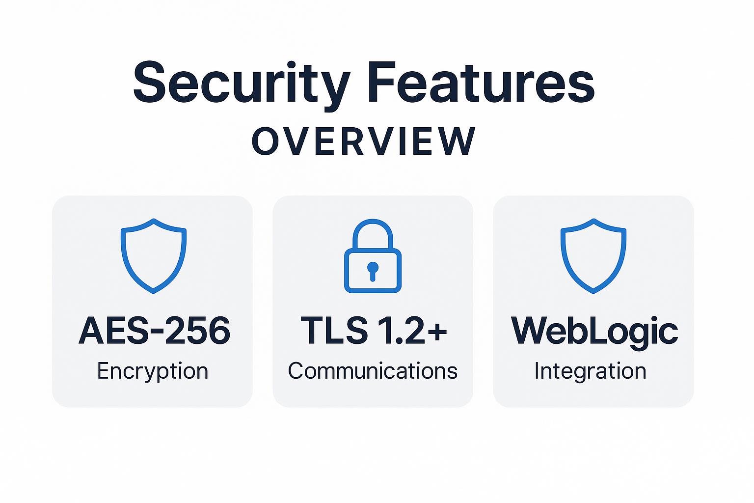 ODI 14c includes enterprise-grade security features such as mandatory AES-256 encryption for sensitive components, WebLogic Server integration for secured production mode, TLS 1.2+ requirements for agent communications, role-based access control, and encrypted connections for secure credential storage and data transmission.
