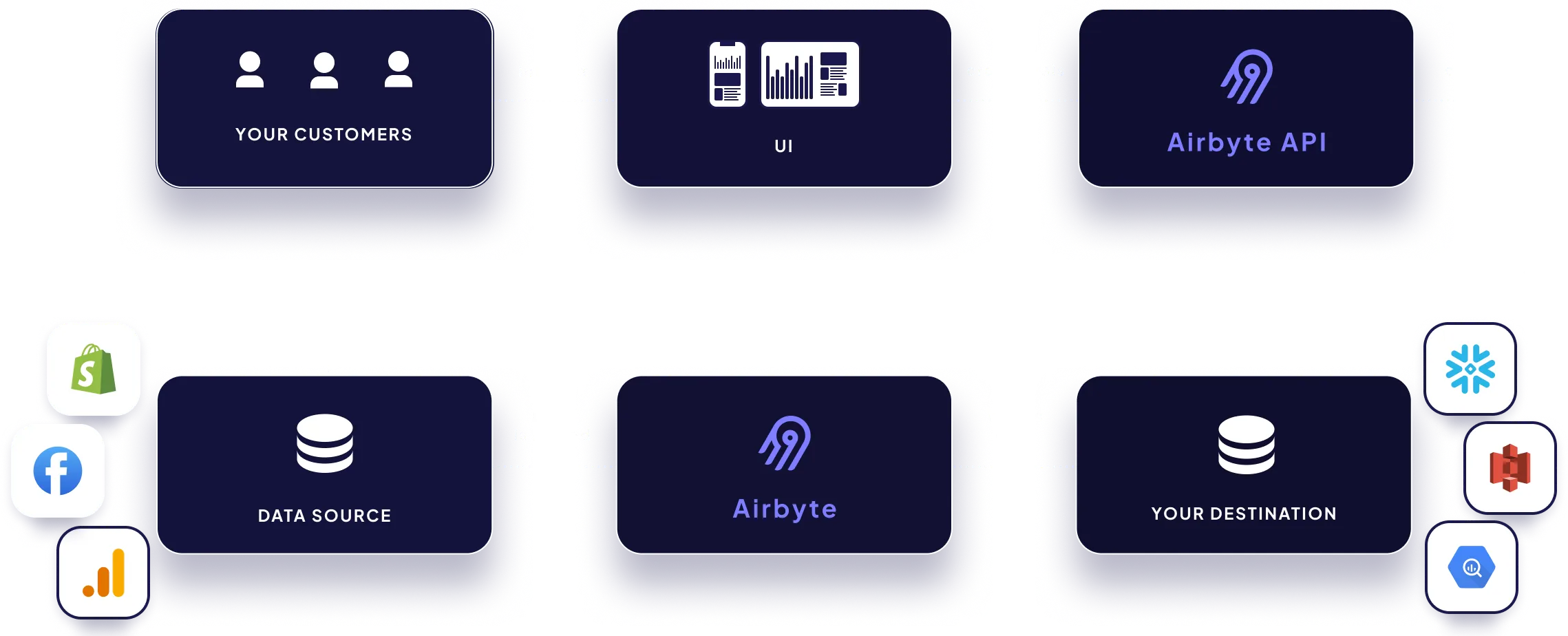 Powered by Airbyte enables your customers to sync their data into your system, no matter the source. No data is stored or viewable by Airbyte.
