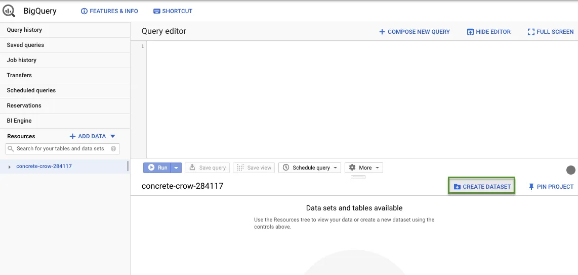 - Click on the project ID in the left-side navigation bar, followed by +CREATE DATASET.