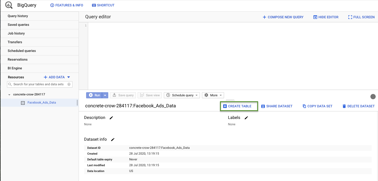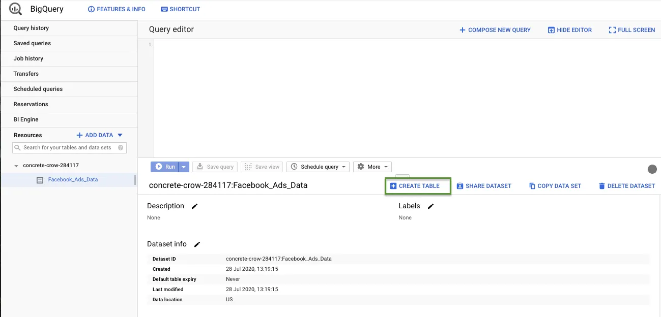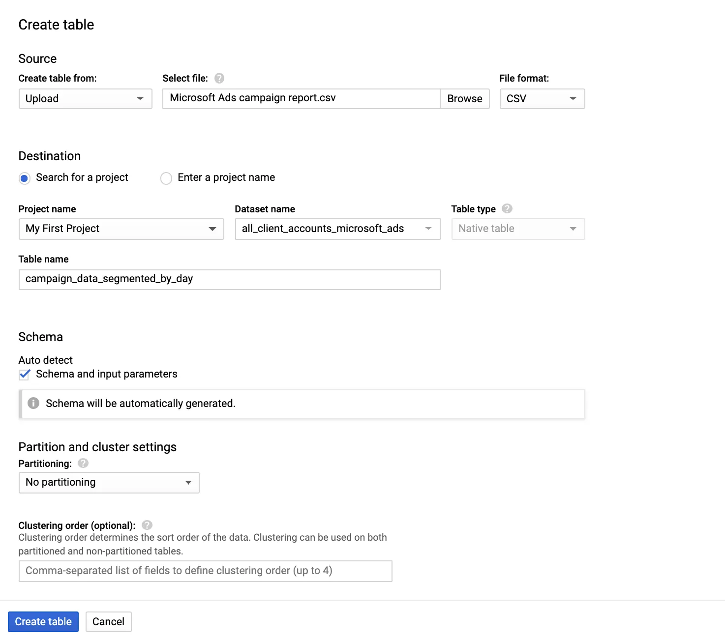 - Finally, click the Create Table button, and BigQuery will start populating the Bing Ads data into the table.