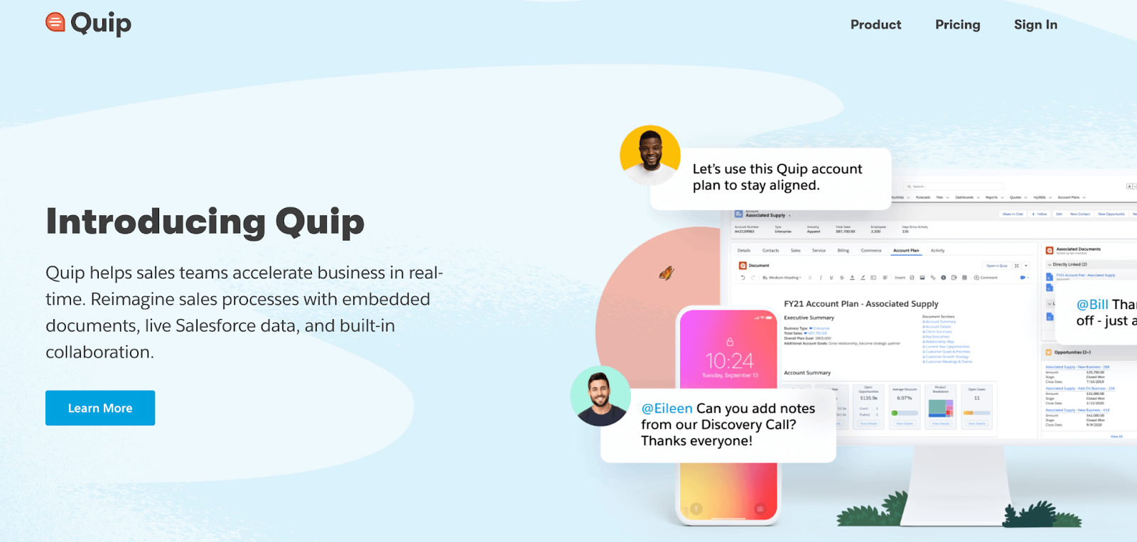 Quip by Salesforce combines documents, spreadsheets, and chat into one collaborative platform. It allows teams to communicate and work on shared files simultaneously, with strong Salesforce integration for business users.