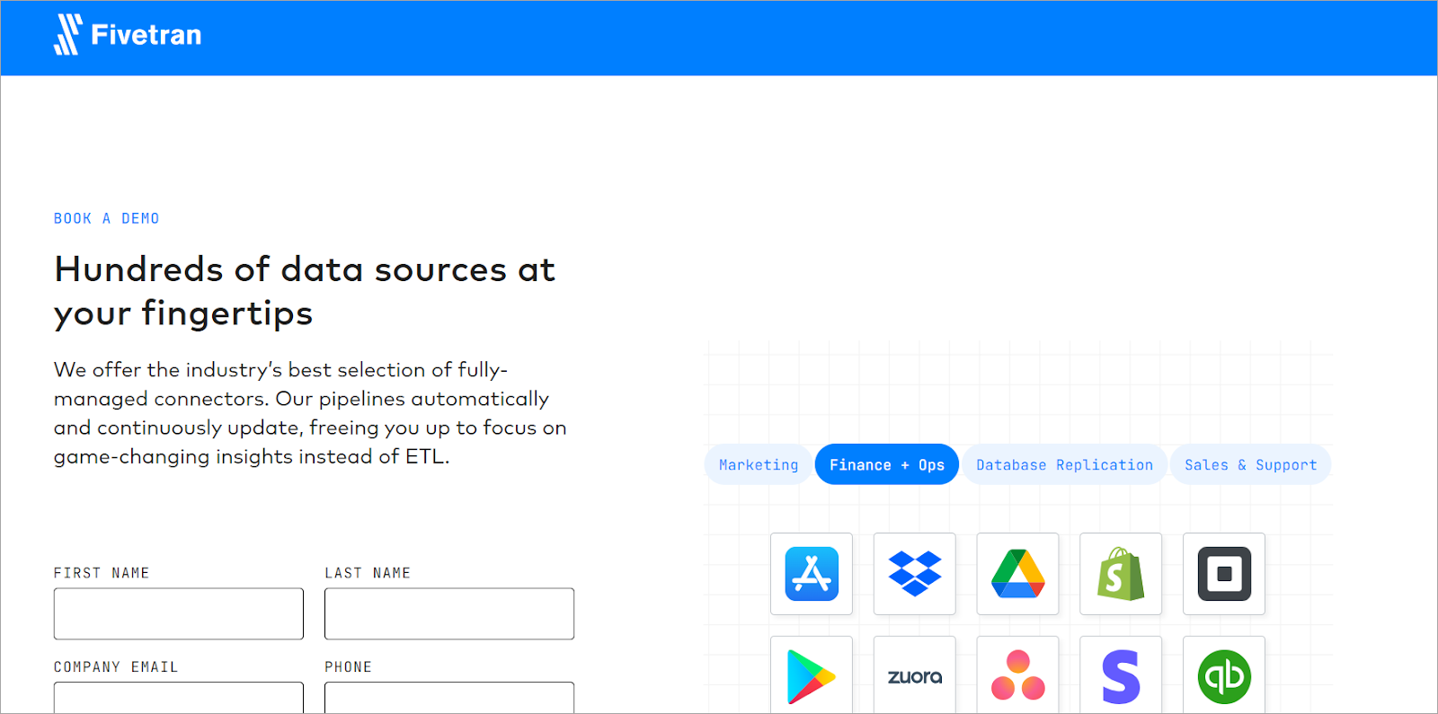 - Pre-built Connectors: Fivetran supports a very rich library of pre-built connectors to widely used cloud applications, databases, and SaaS tools. This means that you will not have to build and maintain a custom code base for each one of your disparate data sources.