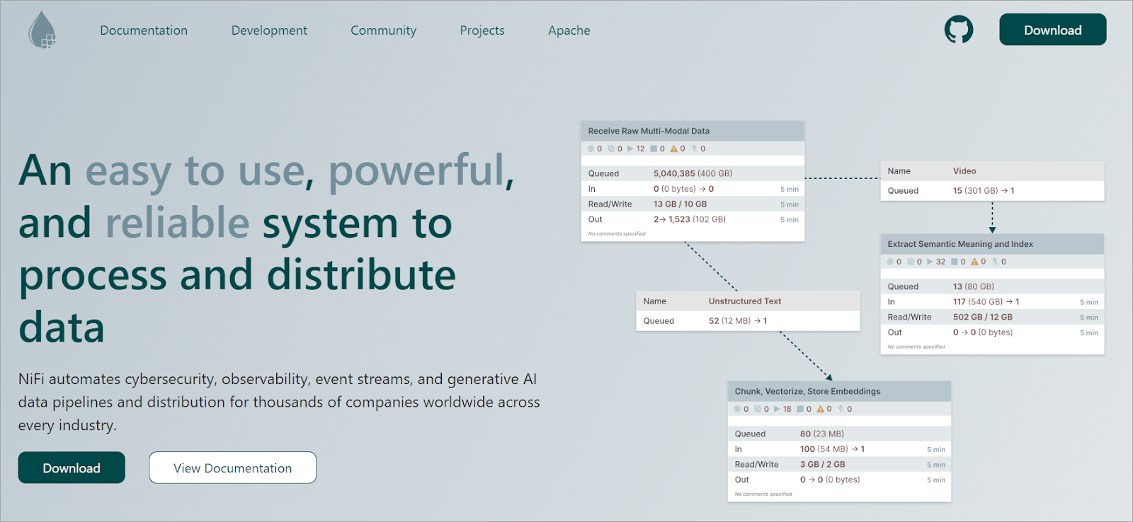 Apache NiFi is a reliable, open-source tool for data ingestion and processing that enables the transfer of data between multiple systems. Originally built for managing data transfers between software applications, NiFi has an easy-to-use interface for building, viewing, and managing data pipelines. It is very easy to use and allows for the creation of complex processes and tasks through a drag-and-drop feature.