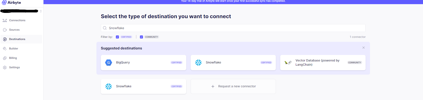 - Type Snowflake in the Search box of the destination page and click on the connector.