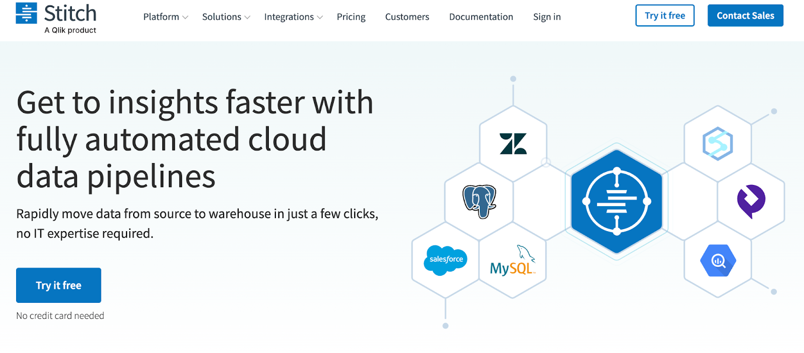 Stitch is a simple, cloud-first ETL tool designed for rapid data replication to cloud warehouses like Snowflake. It provides a straightforward setup experience and offers over 130 data source connectors to get your pipeline running quickly. Stitch is especially suitable for small to mid-sized teams looking for minimal management overhead.