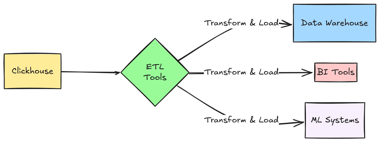 Clickhouse ETL is the process of extracting your analytical data from Clickhouse (the source) and loading it into other systems or databases (the destinations) using ETL tools. Think of it as building a data pipeline that moves your Clickhouse data where you need it - whether that's a data warehouse, BI tool, or any other system that needs access to your Clickhouse data.