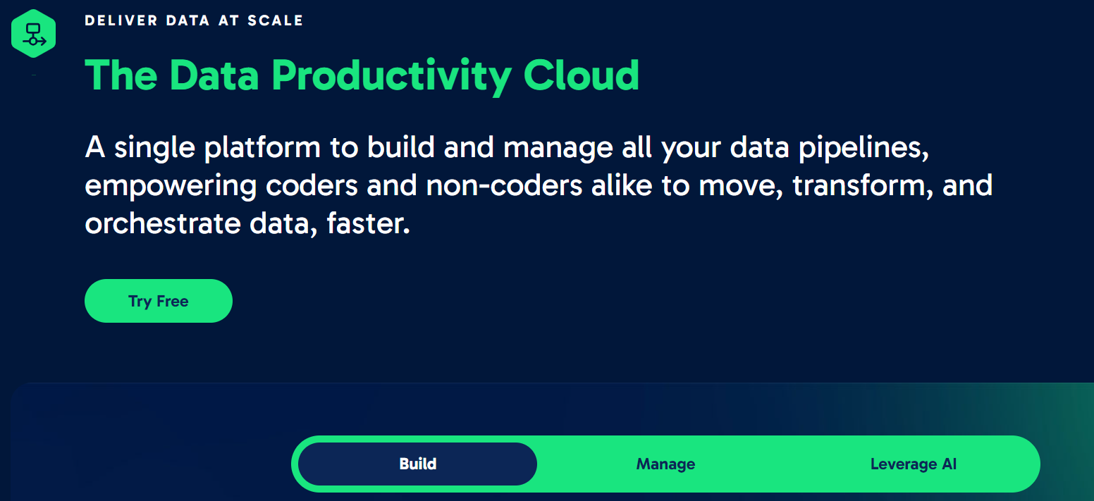 Used by over 40,000 engineers, Airbyte is a popular AI-powered data integration platform that simplifies the process of connecting data sources to target systems. It uses the ELT approach to integrate data from databases, applications, and APIs into data lakes, warehouses, and other repositories.