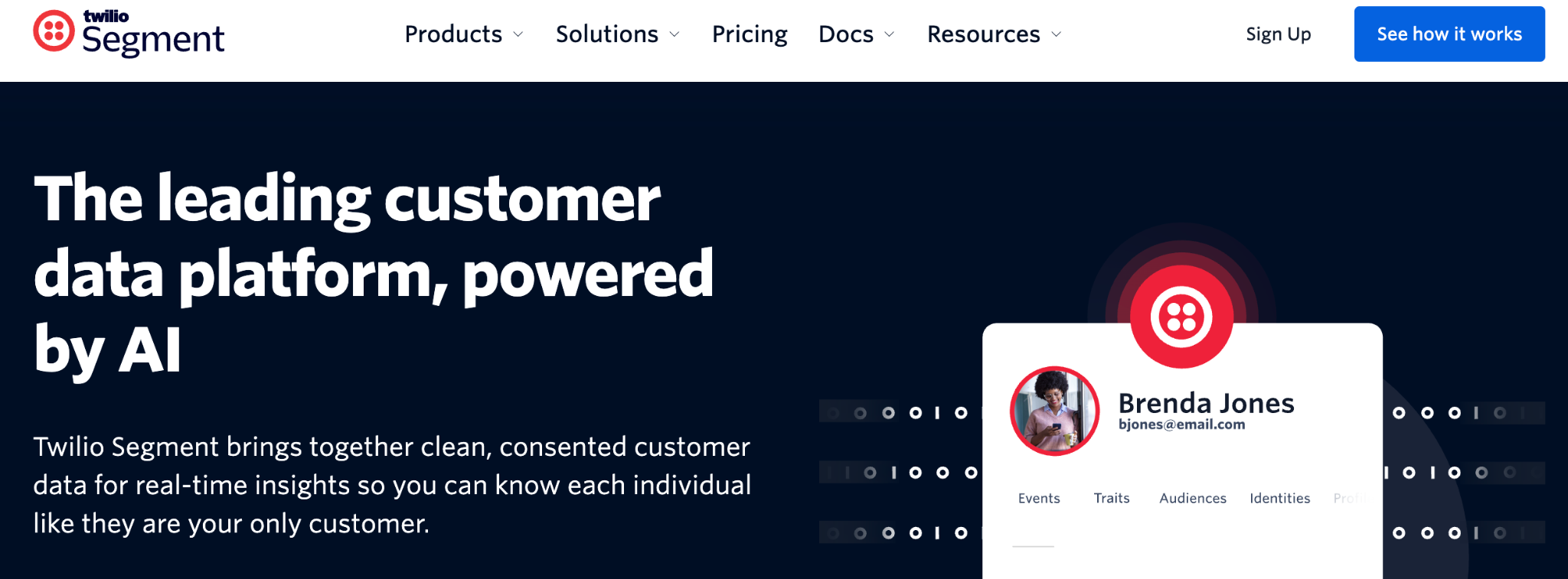 Twilio Segment is a unified customer data platform that empowers you to conduct strong data integration. With over 450+ native connectors, you can connect to marketing automation tools, ad platforms, analytical tools, and data warehouses. Segment provides you with a unified platform to comprehensively understand your customer’s behavioral patterns as it evolves through various touchpoints. It includes web, mobile, third-party sources, and servers.