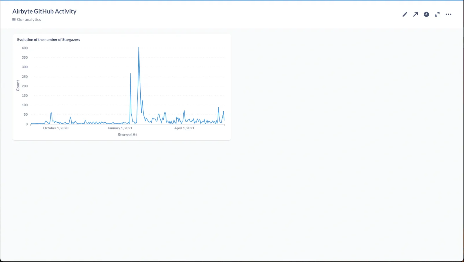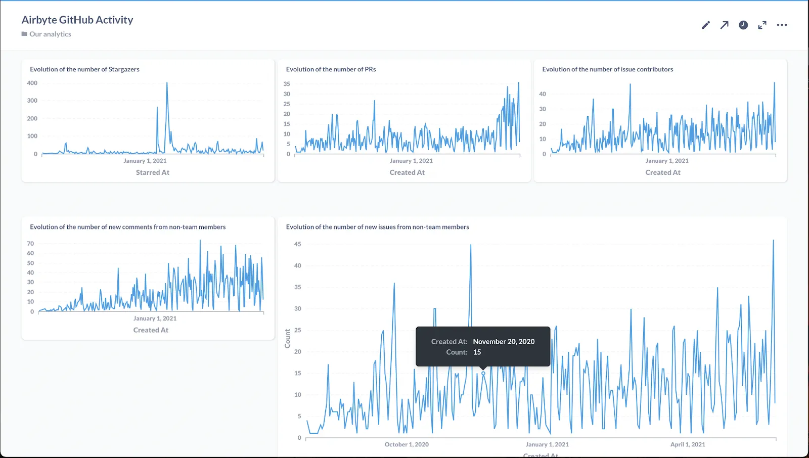 In this article, we will be leveraging Airbyte - an open-source data integration platform and Metabase - an open-source open source way for everyone in your company to ask questions and learn from data - to build the GitHub activity dashboard above.